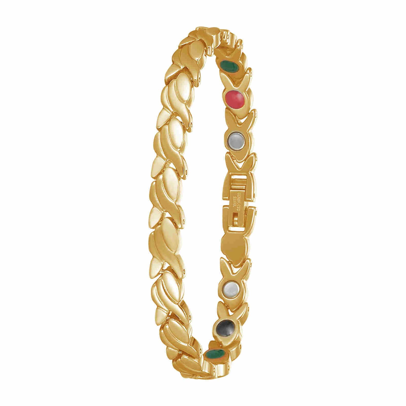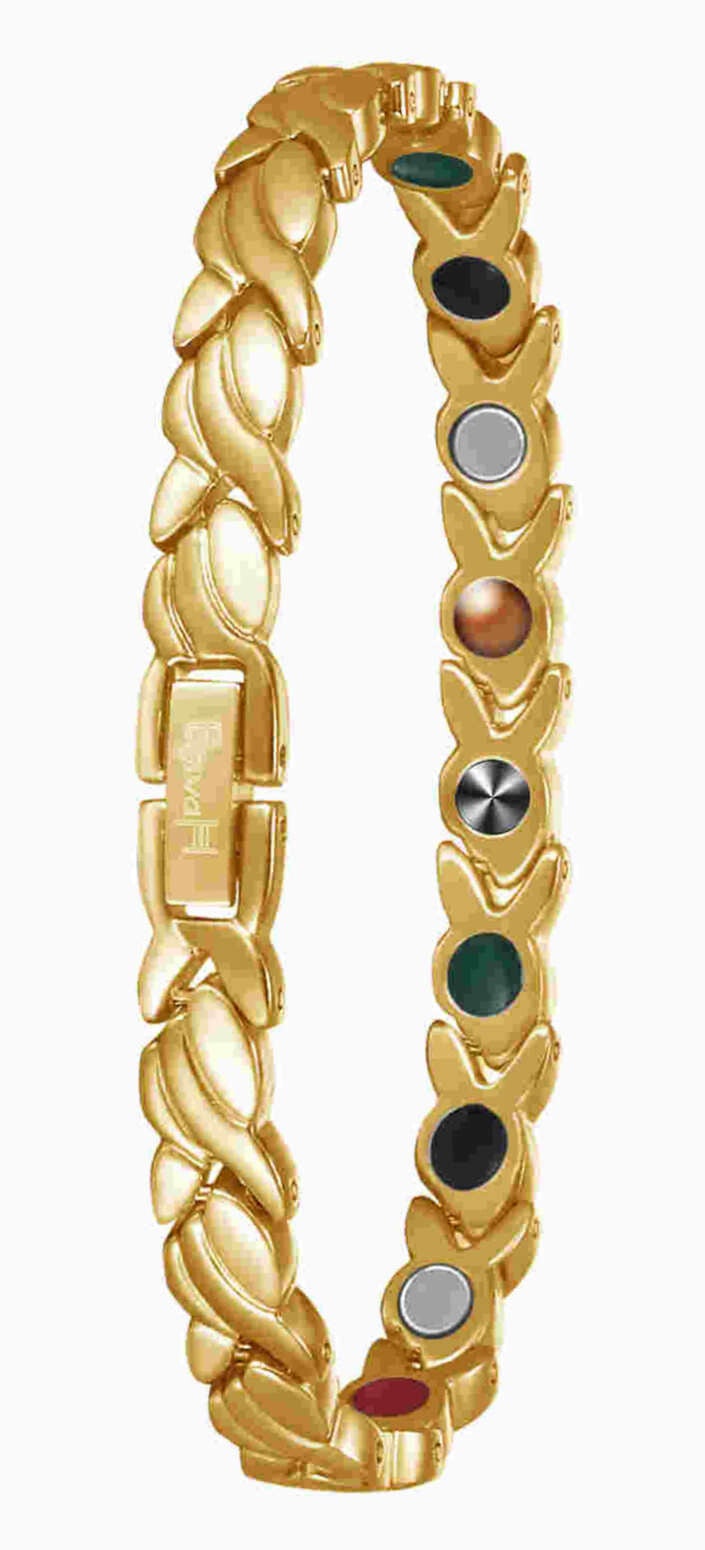 Armband gemaakt van edel (chirurgisch) staal in goudkleur met matte en glanzende accenten. Met easylink voor het gemakkelijk aanpassen van de maat. Elementen 5 in 1: Puur Germanium, Germanium, Toermalijn, Neodymium Magneten, FIR Far Infra Red. Maten: S=17cm, M=18cm, L=19cm, XL=20cm, XXL=21cm, Meerdere maten mogelijk.
