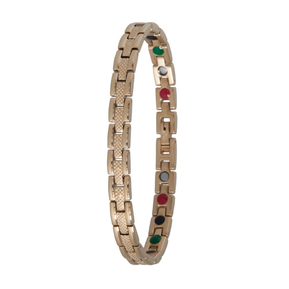24121B Armband gemaakt van edel (chirurgisch) staal in goudkleur met matte en glanzende accenten.Elementen 4 in 1. Germanium, Toermalijn, Neodymium Magneten, FIR Far Infra Red.