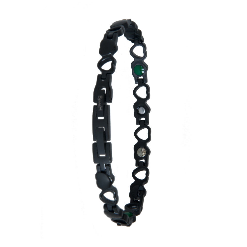 Armband gemaakt van edel (chirurgisch) staal in zwart. Elementen in 1. neodymium magneten, germanium, toermalijn, FIR Far Infra Red. Met easy link voor het gemakkelijk aanpassen van de juiste maat. Maten: S/M=17,7cm, M/L=19,6cm, L/XL=21,5cm.