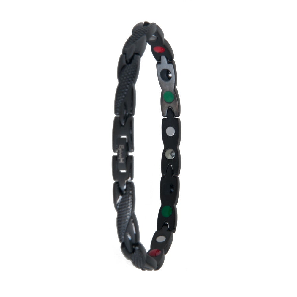 Armband gemaakt van edel (chirurgisch) staal in mat/glanzend zwart staal. Elementen 4 in 1: Neodymium magneten, Germanium, Toermalijn, FIR Far Infra Red. Met easy link voor het gemakkelijk aanpassen van de juiste maat. Maten: S/M=18,2cm, L/XL=20,5cm.