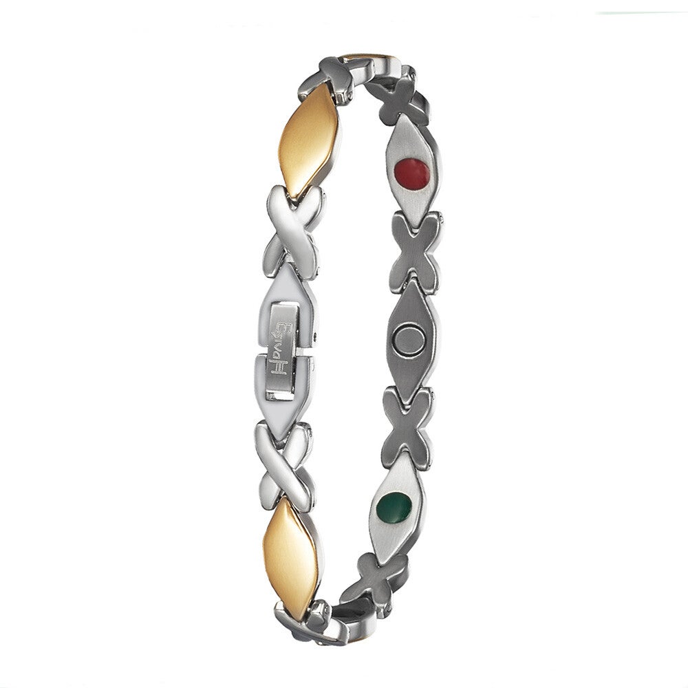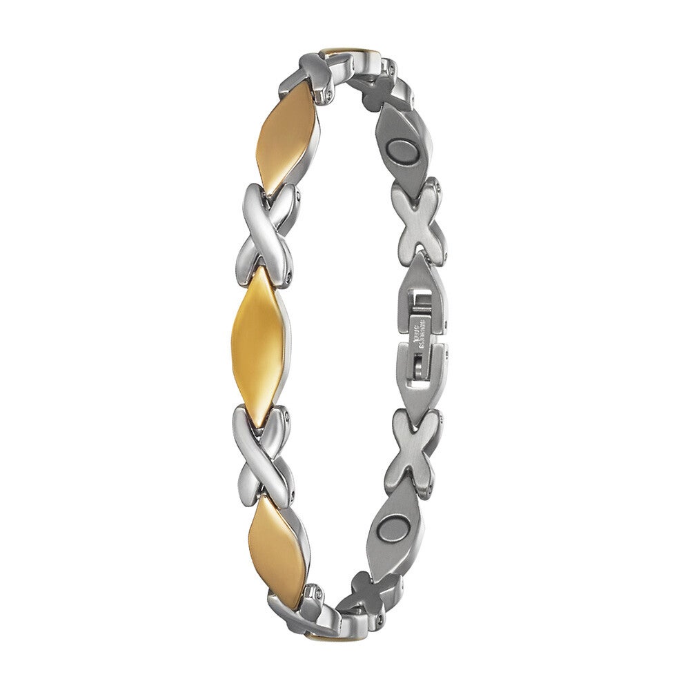 Armband gemaakt van edel (chirurgisch) staal in een zilver / goud. kleurcombinatie. Elementen 5 in 1. Neodymium magneten, (Puur) Germanium, Toermalijn, Far Infra Red, Koper. Met easy link voor het gemakkelijk aanpassen van de juiste maat. Maten: S/M=18,2cm, L/XL=20,5cm, XXL=22,7cm, Meerdere maten mogelijk.